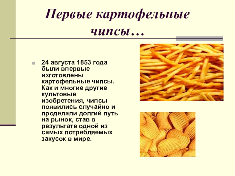 Слайд 15Первые картофельные чипсы…