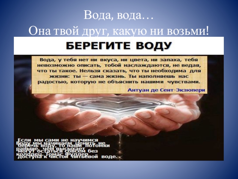 Слайд 16Вода, вода… Она твой друг, какую ни возьми!