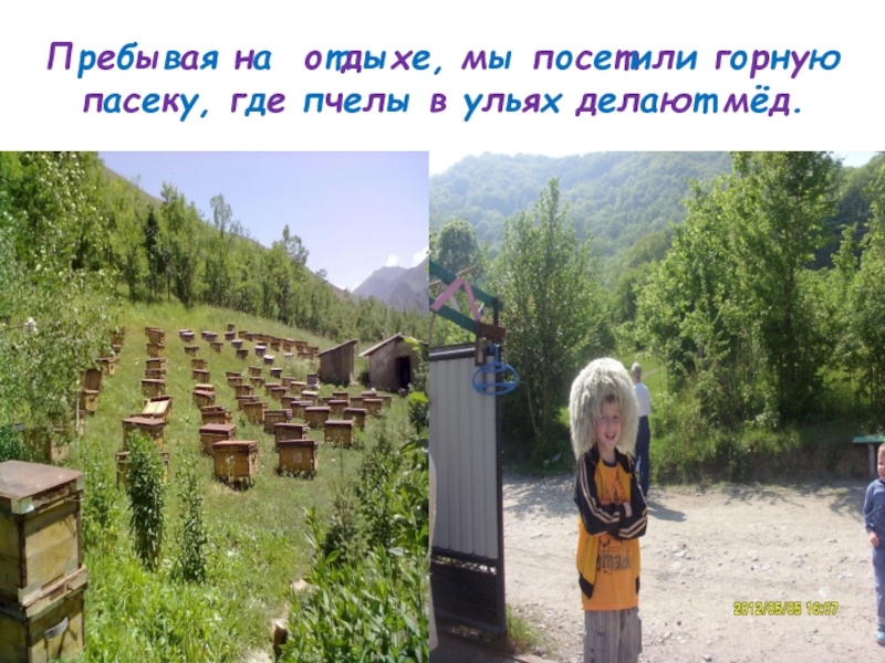 Слайд 13Пребывая на отдыхе, мы посетили горную пасеку, где пчелы в ульях
