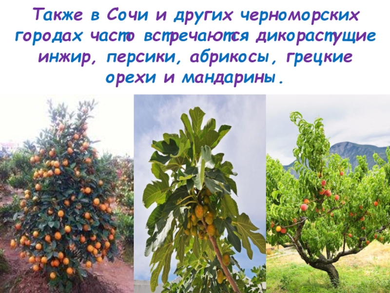 Также в Сочи и других черноморских городах часто встречаются дикорастущие инжир, персики, абрикосы, грецкие орехи и мандарины.