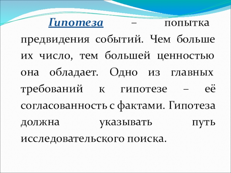 Гипотеза – попытка предвидения событий. Чем больше их число, тем большей ценностью она обладает. Одно из главных