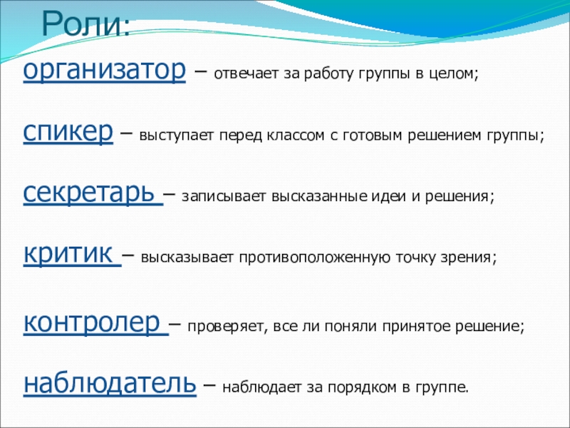 Роли:организатор – отвечает за работу группы в целом; спикер – выступает перед классом с готовым решением группы;