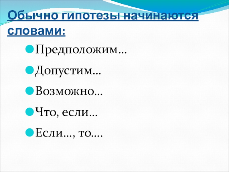 Обычно гипотезы начинаются словами:Предположим…Допустим…Возможно…Что, если…Если…, то….