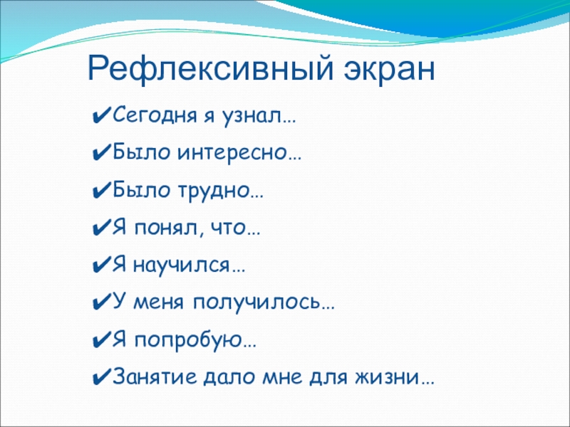 Рефлексивный экранСегодня я узнал…Было интересно…Было трудно…Я понял, что…Я научился…У меня получилось…Я попробую…Занятие дало мне для жизни…
