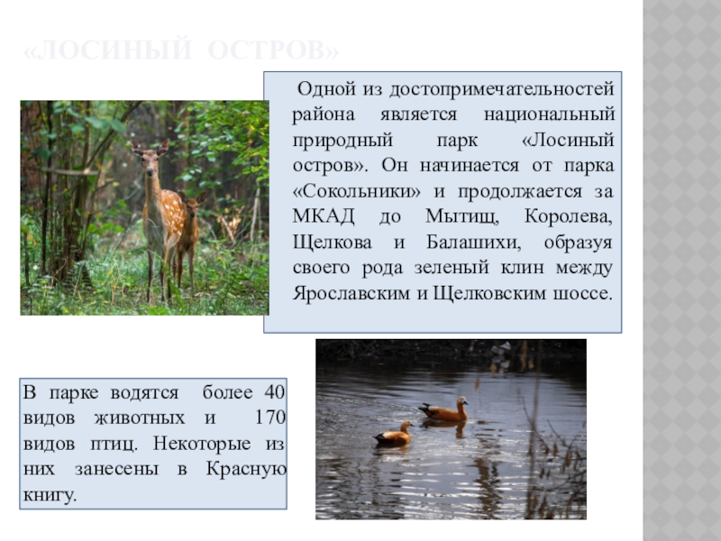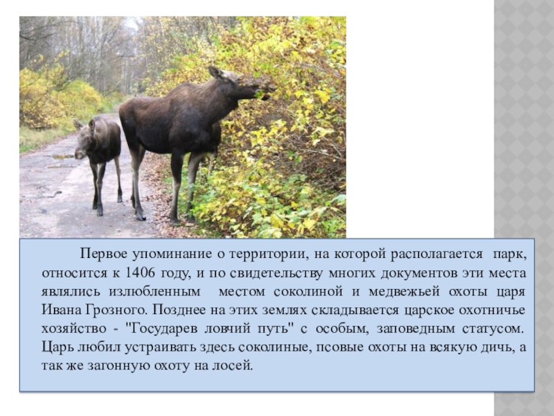 В парке водятся более 40 видов животных и 170 видов птиц. Некоторые из них занесены в Красную книгу.