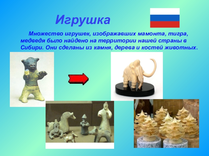 Множество игрушек, изображавших мамонта, тигра, медведя было найдено на территории нашей страны в Сибири. Они сделаны из камня, дерева и костей животных.