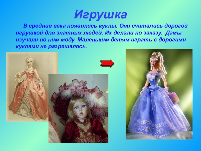 дорогой игрушкой для знатных людей. Их делали по заказу. Дамы изучали по ним моду. Маленьким детям играть с дорогими куклами не разрешалось.