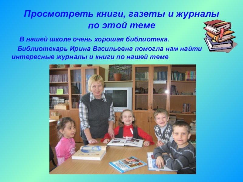 Библиотекарь Ирина Васильевна помогла нам найти интересные журналы и книги по нашей теме