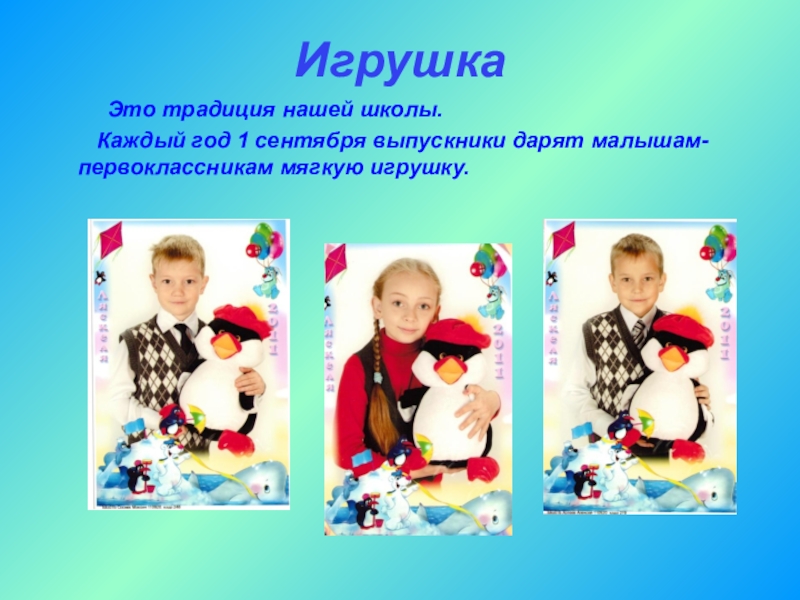 Каждый год 1 сентября выпускники дарят малышам- первоклассникам мягкую игрушку.