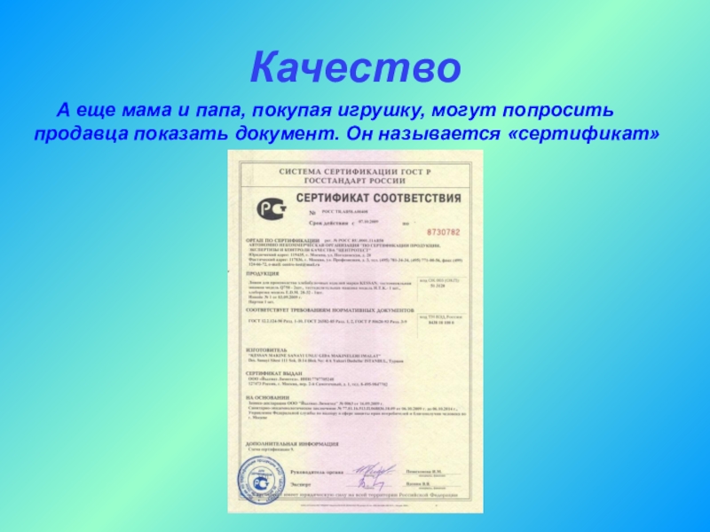 игрушку, могут попросить продавца показать документ. Он называется «сертификат»