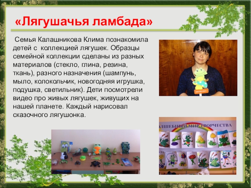 лягушек. Образцы семейной коллекции сделаны из разных материалов (стекло, глина, резина, ткань), разного назначения (шампунь, мыло, колокольчик, новогодняя игрушка, подушка, светильник). Дети посмотрели видео про живых лягушек, живущих на нашей планете. Каждый нарисовал сказочного лягушонка.