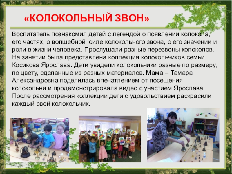 о волшебной силе колокольного звона, о его значении и роли в жизни человека. Прослушали разные перезвоны колоколов. На занятии была представлена коллекция колокольчиков семьи Косикова Ярослава. Дети увидели колокольчики разные по размеру, по цвету, сделанные из разных материалов. Мама – Тамара Александровна поделилась впечатлением от посещения колокольни и продемонстрировала видео с участием Ярослава. После рассмотрения коллекции дети с удовольствием раскрасили каждый свой колокольчик.