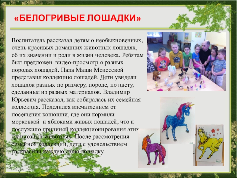 лошадях, об их значении и роли в жизни человека. Ребятам был предложен видео-просмотр о разных породах лошадей. Папа Маши Моисеевой представил коллекцию лошадей. Дети увидели лошадок разных по размеру, породе, по цвету, сделанные из разных материалов. Владимир Юрьевич рассказал, как собиралась их семейная коллекция. Поделился впечатлением от посещения конюшни, где они кормили морковкой и яблоками живых лошадей, что и послужило причиной коллекционирования этих грациозных животных. После рассмотрения семейной коллекции, дети с удовольствием раскрасили каждую свою лошадку.