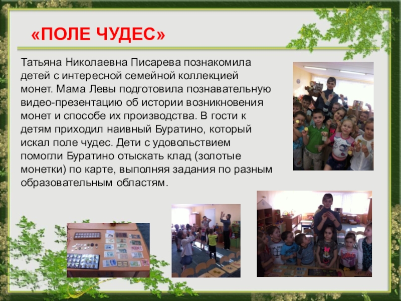 коллекцией монет. Мама Левы подготовила познавательную видео-презентацию об истории возникновения монет и способе их производства. В гости к детям приходил наивный Буратино, который искал поле чудес. Дети с удовольствием помогли Буратино отыскать клад (золотые монетки) по карте, выполняя задания по разным образовательным областям.