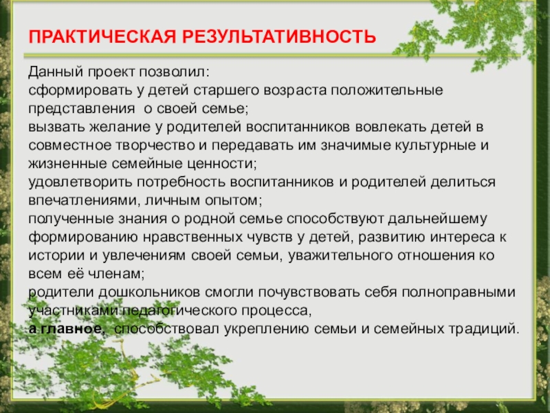 полученные знания о родной семье способствуют дальнейшему формированию нравственных чувств у детей, развитию интереса к истории и увлечениям своей семьи, уважительного отношения ко всем её членам;