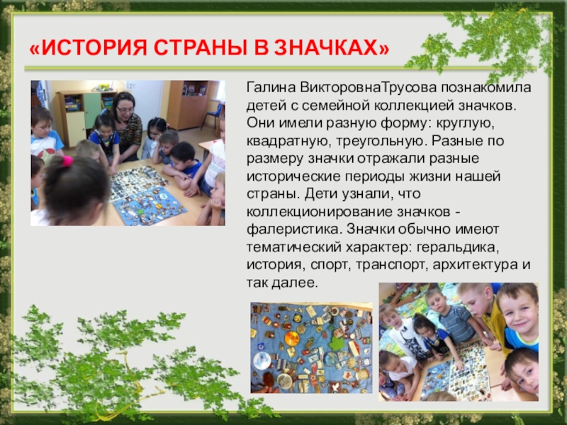 Галина ВикторовнаТрусова познакомила детей с семейной коллекцией значков.