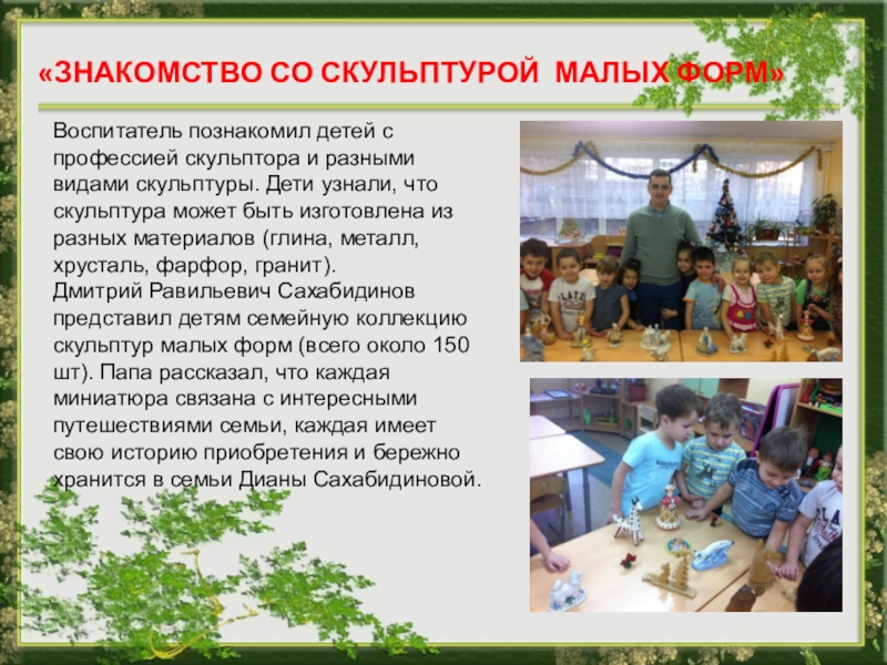 Дмитрий Равильевич Сахабидинов представил детям семейную коллекцию скульптур малых форм (всего около 150 шт). Папа рассказал, что каждая миниатюра связана с интересными путешествиями семьи, каждая имеет свою историю приобретения и бережно хранится в семьи Дианы Сахабидиновой.