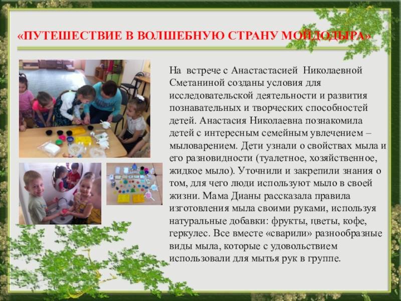условия для исследовательской деятельности и развития познавательных и творческих способностей детей. Анастасия Николаевна познакомила детей с интересным семейным увлечением – мыловарением. Дети узнали о свойствах мыла и его разновидности (туалетное, хозяйственное, жидкое мыло). Уточнили и закрепили знания о том, для чего люди используют мыло в своей жизни. Мама Дианы рассказала правила изготовления мыла своими руками, используя натуральные добавки: фрукты, цветы, кофе, геркулес. Все вместе «сварили» разнообразные виды мыла, которые с удовольствием использовали для мытья рук в группе.