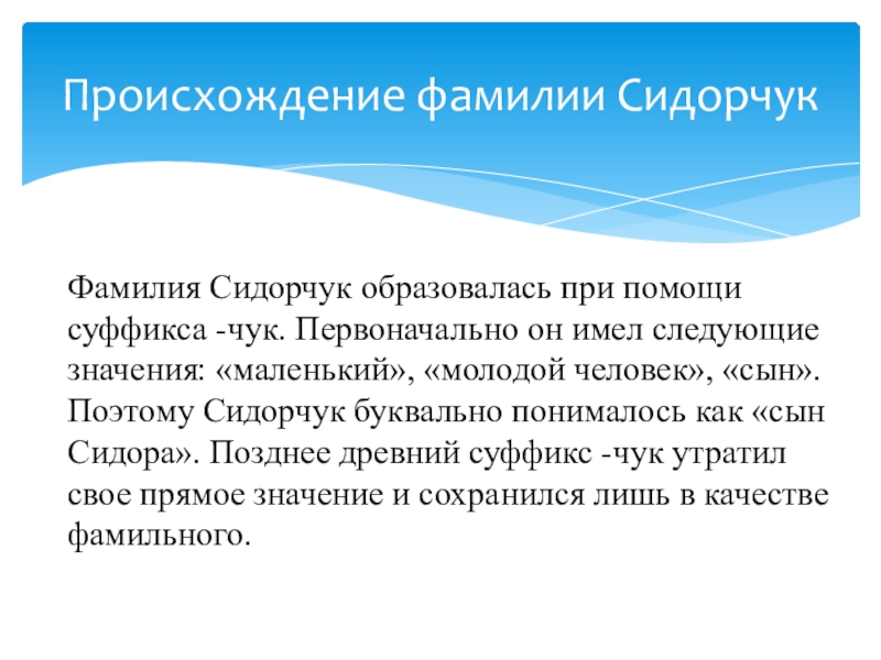 имел следующие значения: «маленький», «молодой человек», «сын». Поэтому Сидорчук буквально понималось как «сын Сидора». Позднее древний суффикс -чук утратил свое прямое значение и сохранился лишь в качестве фамильного.