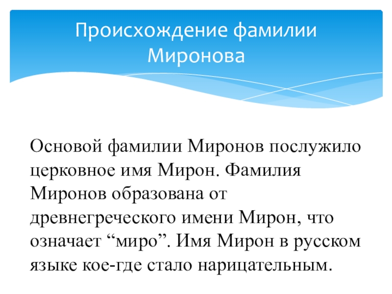 Основой фамилии Миронов послужило церковное имя Мирон. Фамилия Миронов