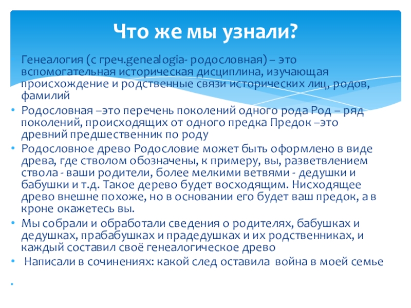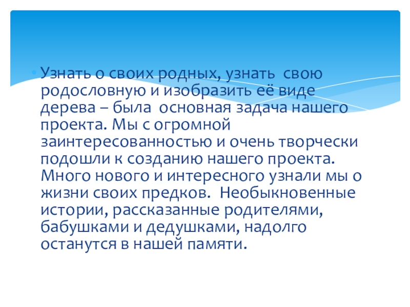 дерева – была основная задача нашего проекта. Мы с огромной заинтересованностью и очень творчески подошли к созданию нашего проекта. Много нового и интересного узнали мы о жизни своих предков. Необыкновенные истории, рассказанные родителями, бабушками и дедушками, надолго останутся в нашей памяти.