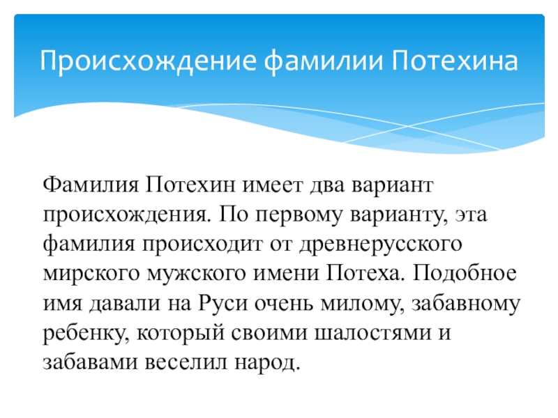 Фамилия Потехин имеет два вариант происхождения. По первому варианту,