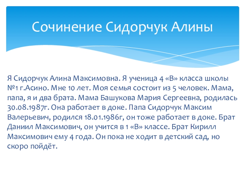 школы №1 г.Асино. Мне 10 лет. Моя семья состоит из 5 человек. Мама, папа, я и два брата. Мама Башукова Мария Сергеевна, родилась 30.08.1987г. Она работает в доке. Папа Сидорчук Максим Валерьевич, родился 18.01.1986г, он тоже работает в доке. Брат Даниил Максимович, он учится в 1 «В» классе. Брат Кирилл Максимович ему 4 года. Он пока не ходит в детский сад, но скоро пойдёт.
