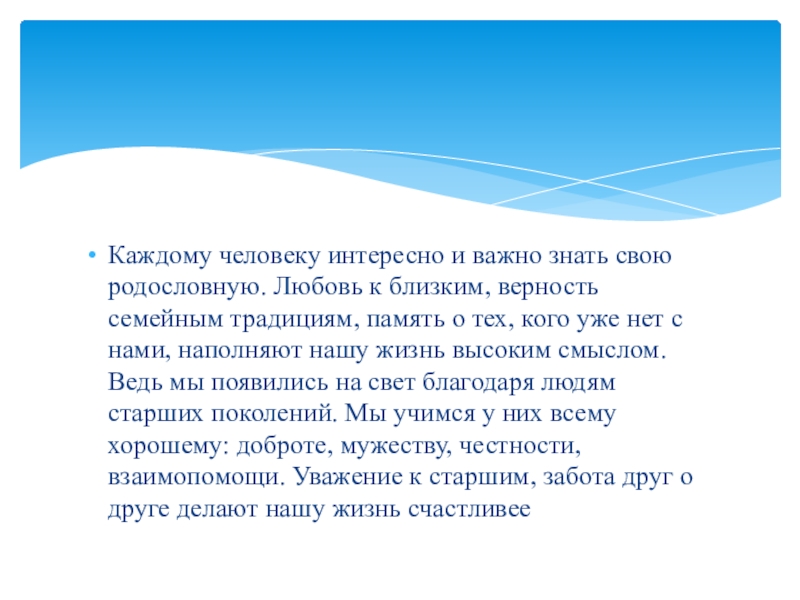 Слайд 5Каждому человеку интересно и важно знать свою родословную. Любовь к близким,