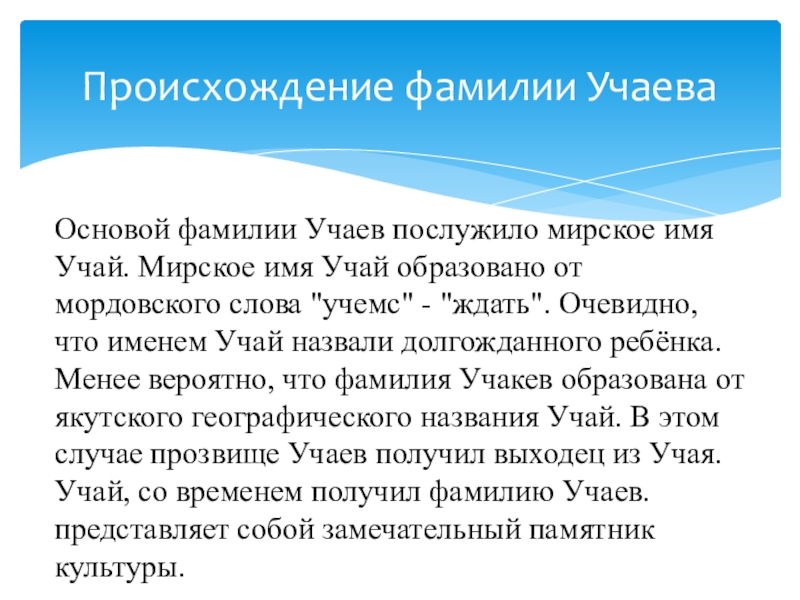 Основой фамилии Учаев послужило мирское имя Учай. Мирское имя