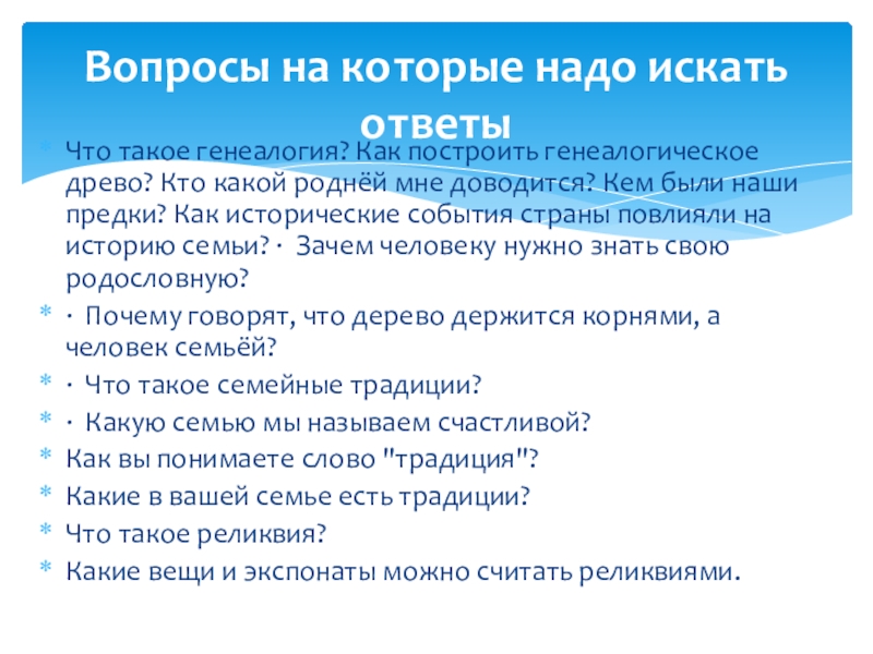доводится? Кем были наши предки? Как исторические события страны повлияли на историю семьи? · Зачем человеку нужно знать свою родословную?