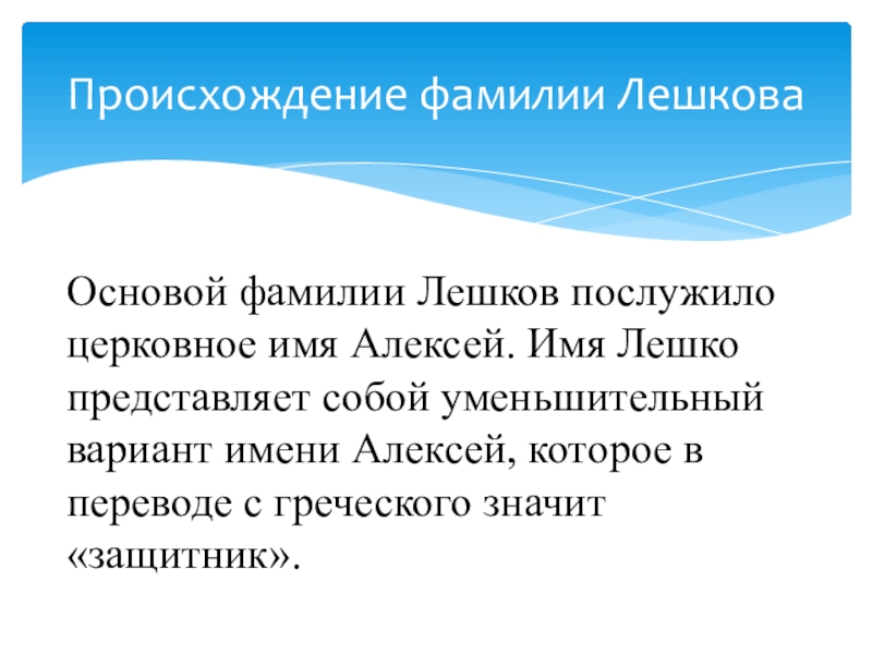 Основой фамилии Лешков послужило церковное имя Алексей. Имя Лешко
