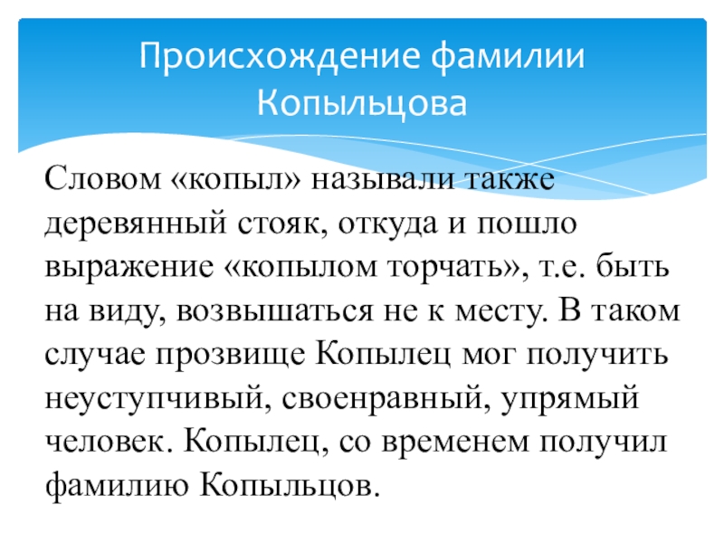выражение «копылом торчать», т.е. быть на виду, возвышаться не к месту. В таком случае прозвище Копылец мог получить неуступчивый, своенравный, упрямый человек. Копылец, со временем получил фамилию Копыльцов.