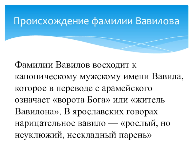 Фамилии Вавилов восходит к каноническому мужскому имени Вавила, которое