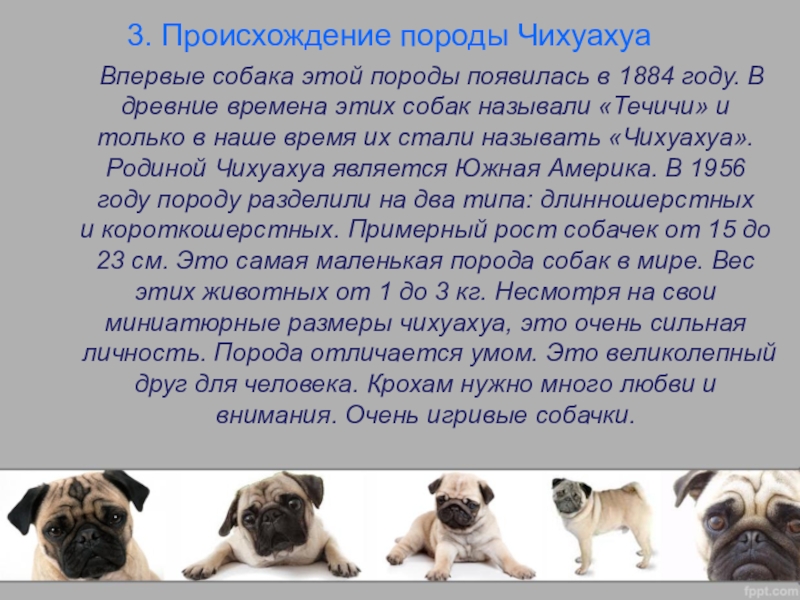 появилась в 1884 году. В древние времена этих собак называли «Течичи» и только в наше время их стали называть «Чихуахуа». Родиной Чихуахуа является Южная Америка. В 1956 году породу разделили на два типа: длинношерстных и короткошерстных. Примерный рост собачек от 15 до 23 см. Это самая маленькая порода собак в мире. Вес этих животных от 1 до 3 кг. Несмотря на свои миниатюрные размеры чихуахуа, это очень сильная личность. Порода отличается умом. Это великолепный друг для человека. Крохам нужно много любви и внимания. Очень игривые собачки.