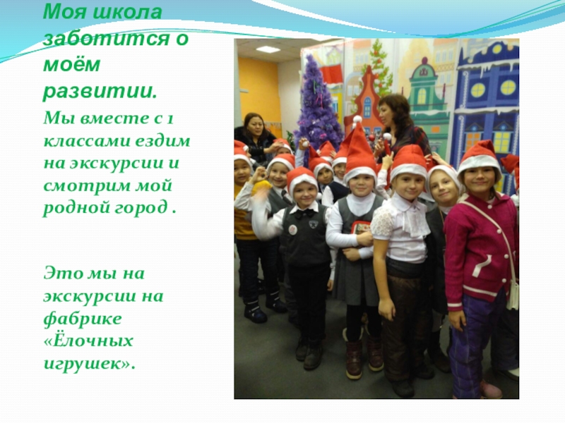 Моя школа заботится о моём развитии.Мы вместе с 1 классами ездим на экскурсии и смотрим мой родной