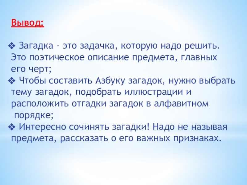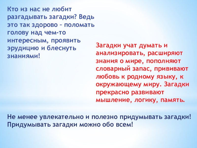 Загадки учат думать и анализировать, расширяют знания о мире, пополняют словарный запас, прививают любовь к родному языку, к окружающему миру. Загадки прекрасно развивают мышление, логику, память.