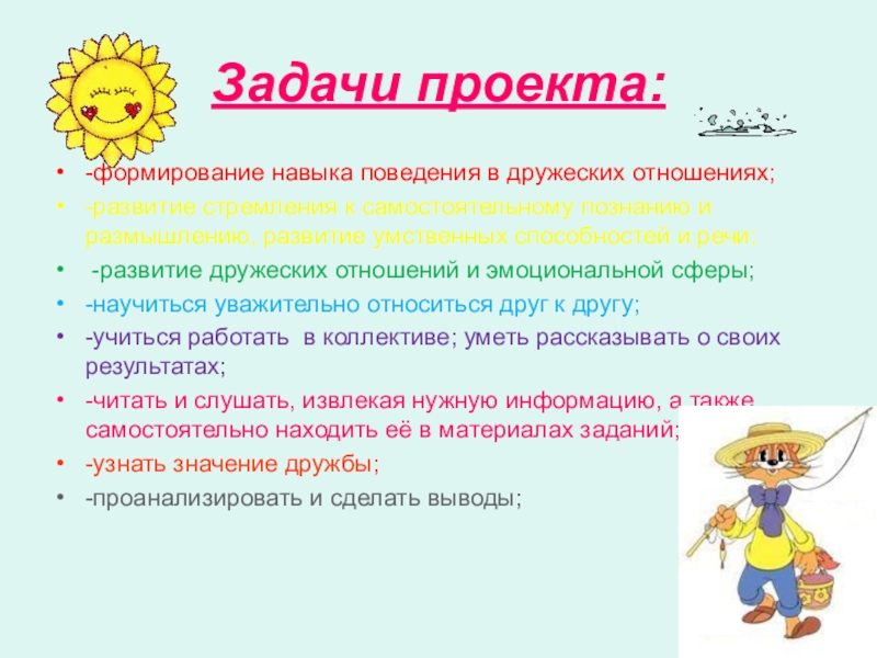 Задачи проекта:-формирование навыка поведения в дружеских отношениях;-развитие стремления к самостоятельному познанию и размышлению, развитие умственных способностей и