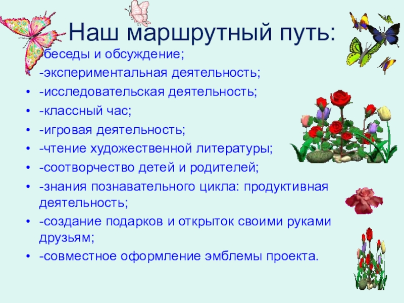 Наш маршрутный путь:-беседы и обсуждение;-экспериментальная деятельность;-исследовательская деятельность;-классный час;-игровая деятельность;-чтение художественной литературы;-соотворчество детей и родителей;-знания познавательного цикла: продуктивная