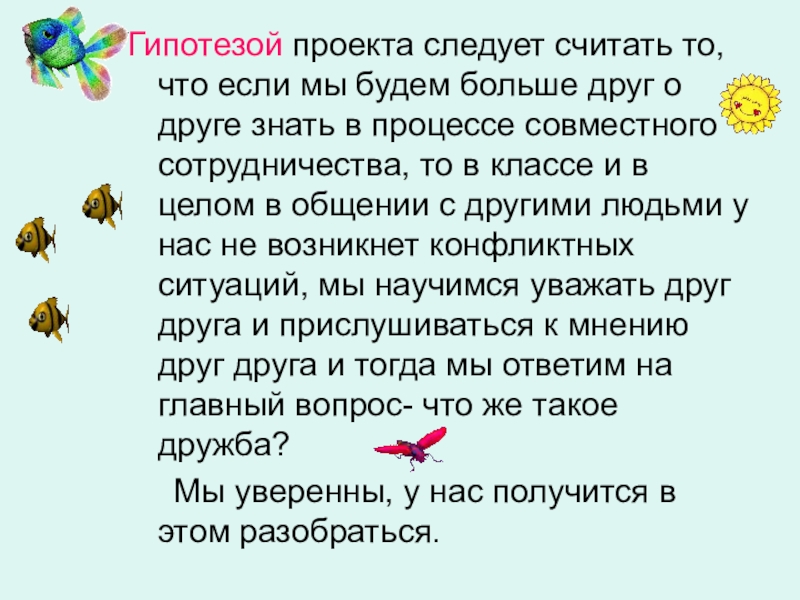 Слайд 8Гипотезой проекта следует считать то, что если мы будем больше друг
