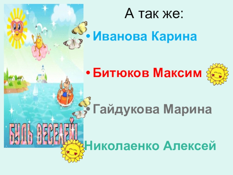 А так же: Иванова КаринаБитюков МаксимГайдукова МаринаНиколаенко Алексей