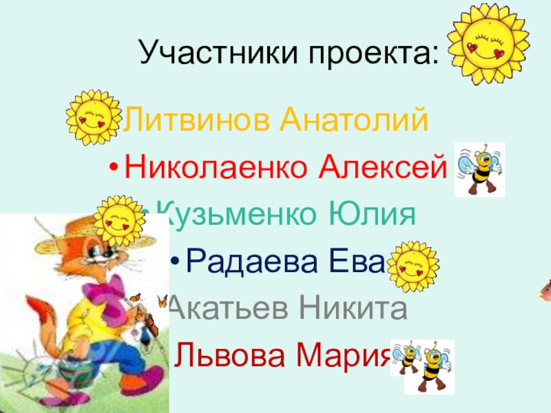 Участники проекта:Литвинов АнатолийНиколаенко АлексейКузьменко ЮлияРадаева ЕваАкатьев НикитаЛьвова Мария