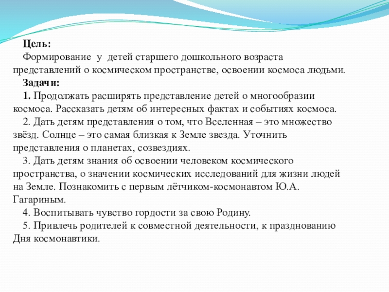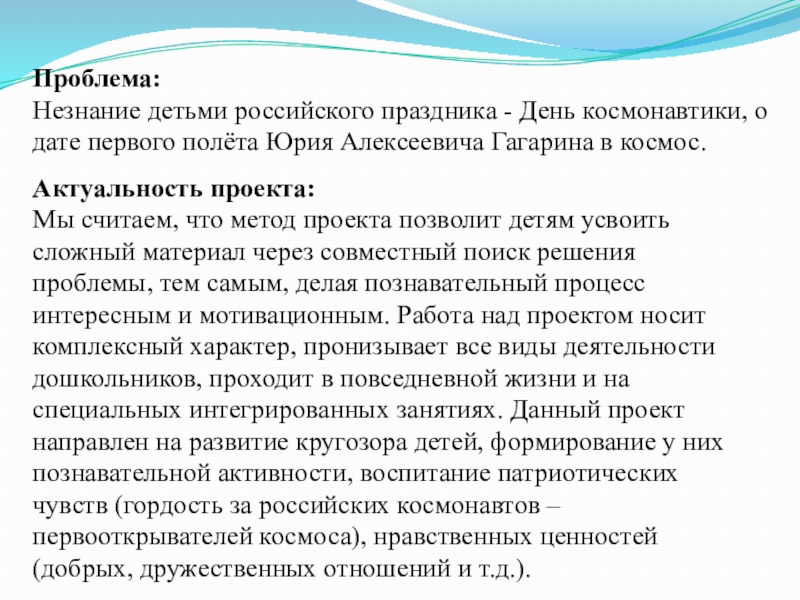 Мы считаем, что метод проекта позволит детям усвоить сложный материал через совместный поиск решения проблемы, тем самым, делая познавательный процесс интересным и мотивационным. Работа над проектом носит комплексный характер, пронизывает все виды деятельности дошкольников, проходит в повседневной жизни и на специальных интегрированных занятиях. Данный проект направлен на развитие кругозора детей, формирование у них познавательной активности, воспитание патриотических чувств (гордость за российских космонавтов – первооткрывателей космоса), нравственных ценностей (добрых, дружественных отношений и т.д.).