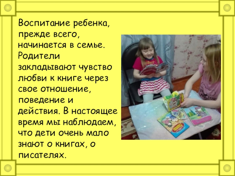 к книге через свое отношение, поведение и действия. В настоящее время мы наблюдаем, что дети очень мало знают о книгах, о писателях.