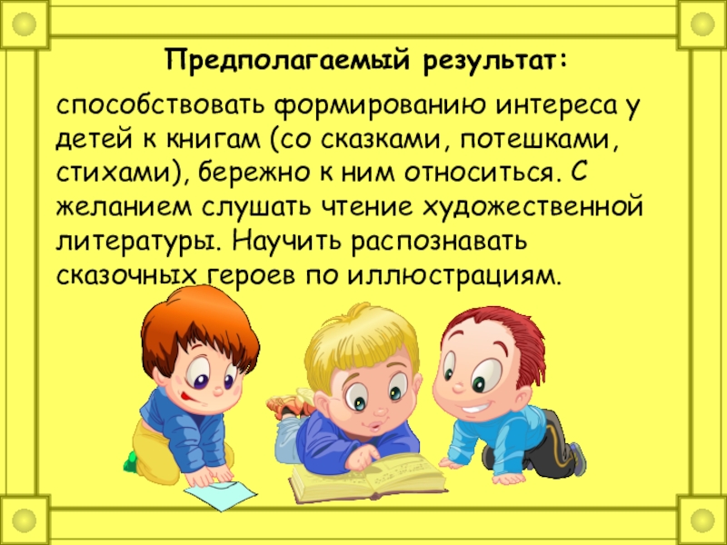 потешками, стихами), бережно к ним относиться. С желанием слушать чтение художественной литературы. Научить распознавать сказочных героев по иллюстрациям.