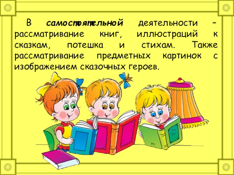 Слайд 14 В самостоятельной деятельности – рассматривание книг, иллюстраций к сказкам, потешка и