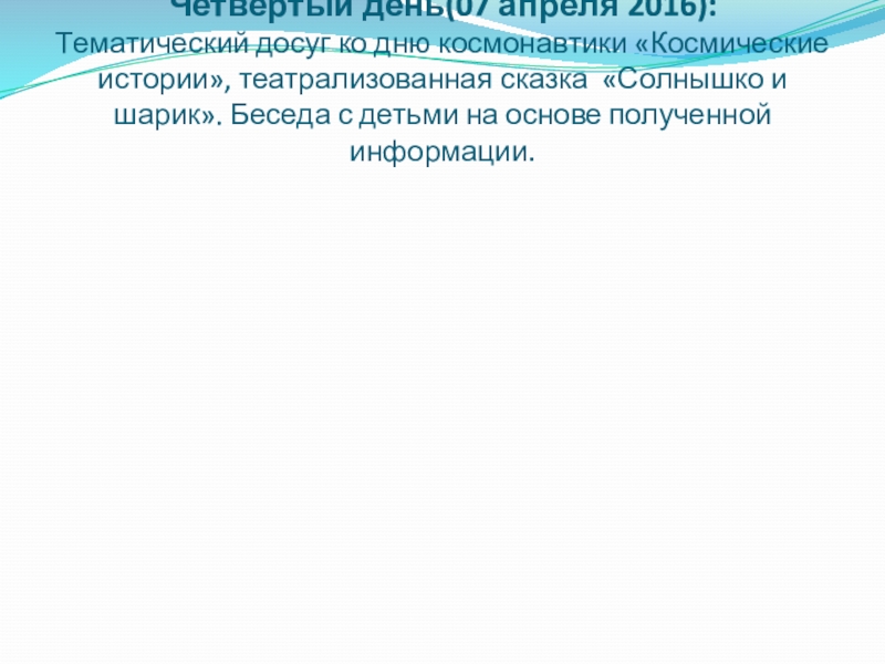 Слайд 8Четвертый день(07 апреля 2016): Тематический досуг ко дню космонавтики «Космические истории», театрализованная