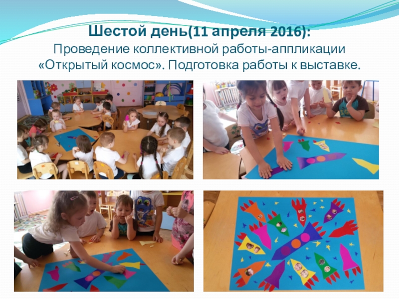 Слайд 10Шестой день(11 апреля 2016): Проведение коллективной работы-аппликации «Открытый космос». Подготовка работы к