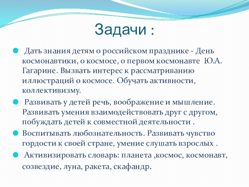 о космосе, о первом космонавте Ю.А.Гагарине. Вызвать интерес к рассматриванию иллюстраций о космосе. Обучать активности, коллективизму.