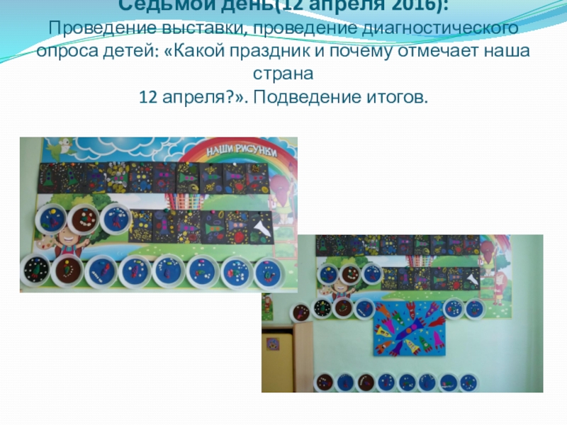 Слайд 11Седьмой день(12 апреля 2016): Проведение выставки, проведение диагностического опроса детей: «Какой праздник