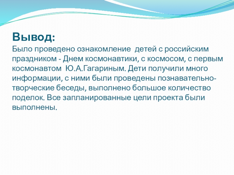 с космосом, с первым космонавтом Ю.А.Гагариным. Дети получили много информации, с ними были проведены познавательно-творческие беседы, выполнено большое количество поделок. Все запланированные цели проекта были выполнены.